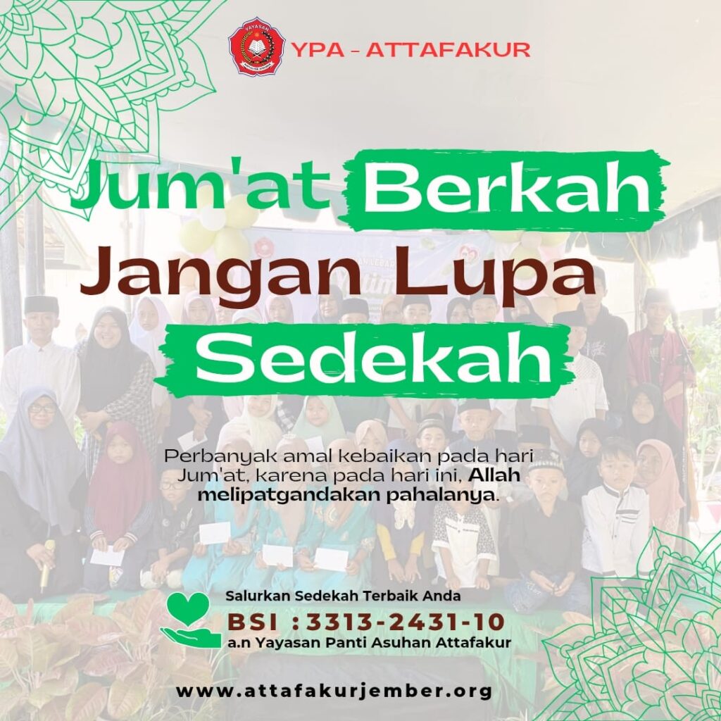 Oleh karena itu, jangan biarkan Jumat ini berlalu begitu saja tanpa meninggalkan jejak kebaikan. Mari kita wujudkan rasa syukur kita dengan tindakan nyata. Ayo, salurkan sedekah terbaik sahabat hari ini melalui Yayasan Panti Asuhan Attafakur, dan rasakan keajaiban serta ketenangan hati yang hadir dari indahnya berbagi.